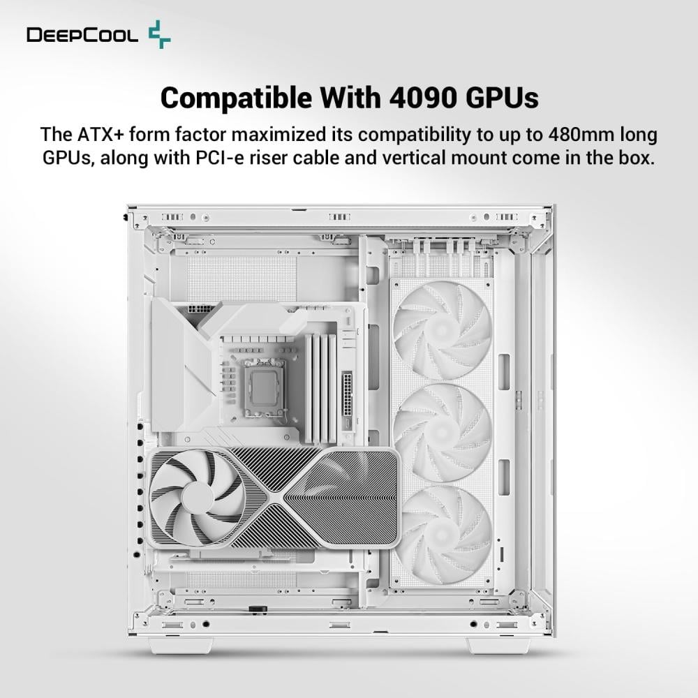 - توافق كبير: تتميز حافظة الكمبيوتر DeepCool CH780 WH البيضاء الكاملة بتوافق رائع لتلبية أجهزة الكمبيوتر الحديثة، ويدعم الهيكل ما يصل إلى اللوحات الأم E-ATX؛ مبردات وحدة المعالجة المركزية بطول 135 مم ومبرد 420 مم في الأعلى/الأسفل؛ وحدات معالجة الرسومات مقاس 480 مم (متوافقة مع وحدات معالجة الرسومات 4090)، ويحد تصميم الغرفة المزدوجة من تركيب وحدة معالجة الرسومات على الوضع الرأسي، ويتم تضمين كابل PCI-e الصاعد والتركيب العمودي في حزمة CH780 WH لتحقيق البناء
