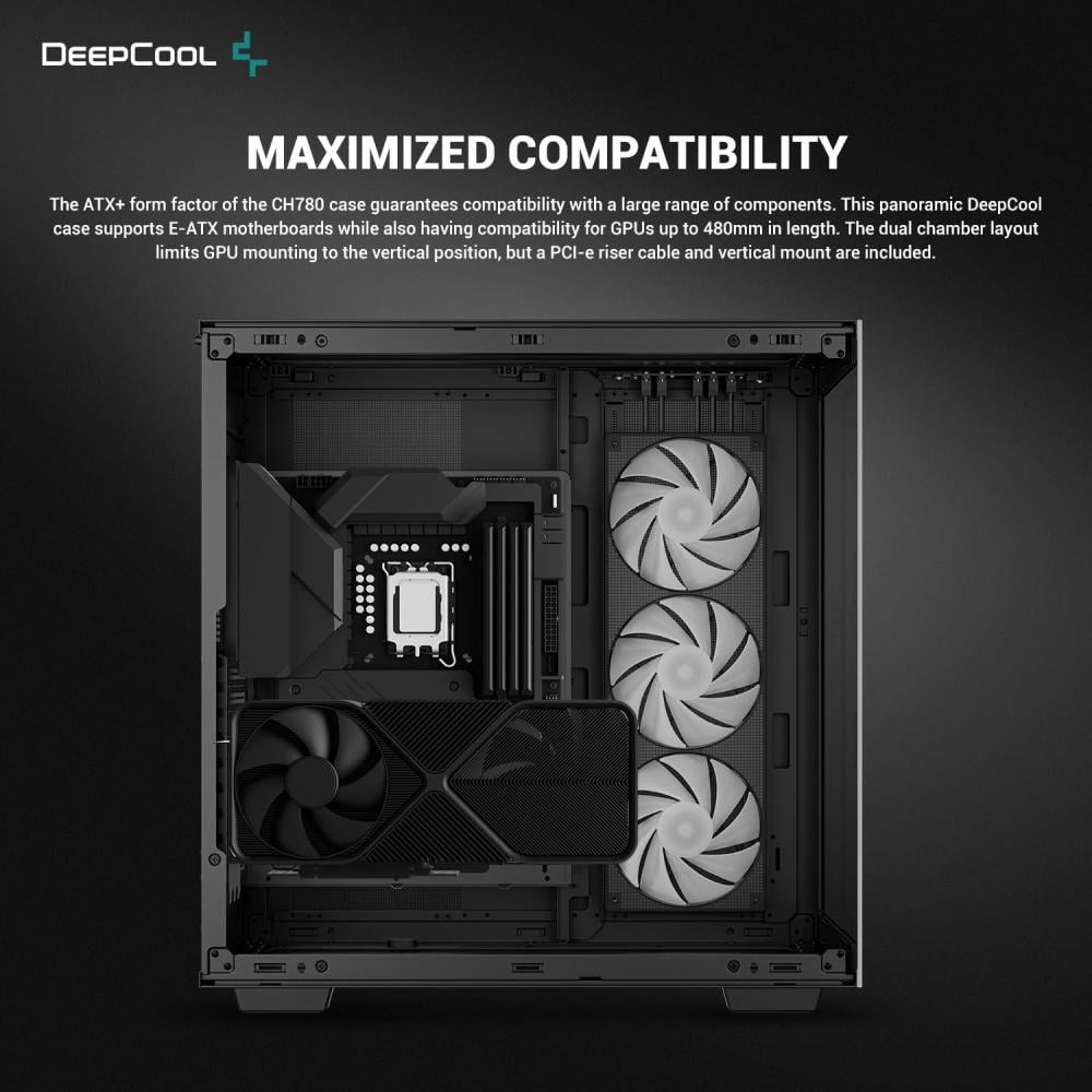 DeepCool CH780 ATX+ Panorama Body, Dual Chamber Configuration, Vertical Installation and Gen 4 Riser Cable, Tempered Glass Panels, Trinity 140 mm ARGB Fan, Type-C, 4 x USB 3.0, Black