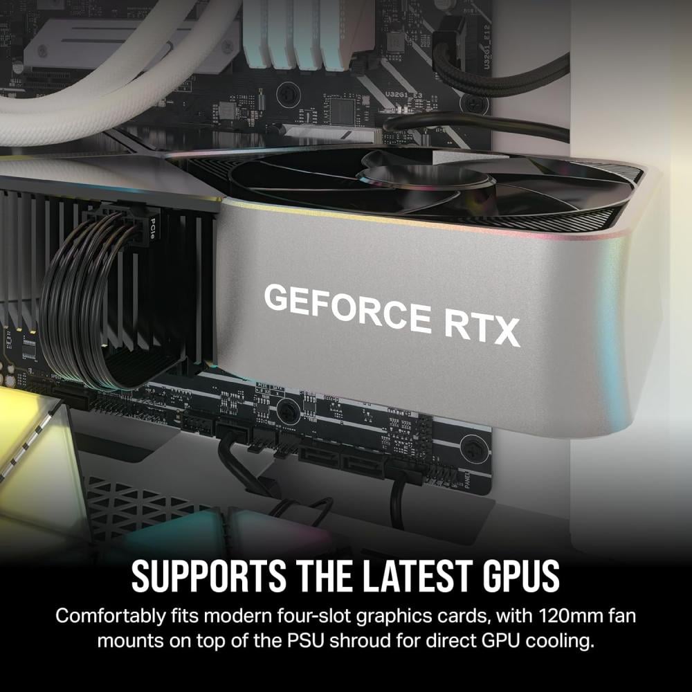 - تبريد وحدة معالجة الرسومات المخصصة: تدعم أحدث بطاقات الرسومات من خلال حاملين إضافيين للمروحة بقطر 120 مم على غطاء وحدة إمداد الطاقة لتثبيت المراوح لتدفق الهواء المباشر إلى وحدة معالجة الرسومات.