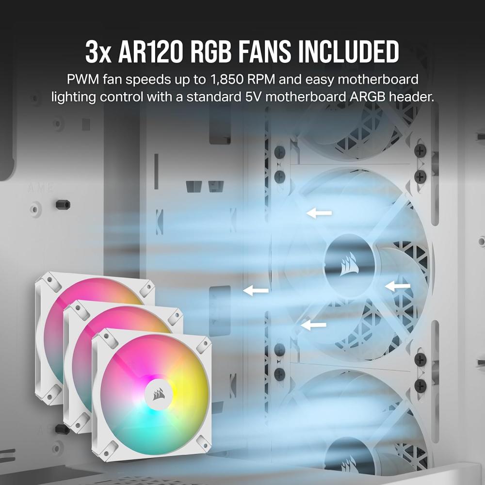- مجموعة كاملة متوسطة الحجم: هيكل ATX متوسط الحجم يجمع بين تصميم تدفق الهواء العالي والجماليات المذهلة، ويتميز بثلاث مراوح CORSAIR AR120 RGB مثبتة مسبقًا لتبريد ممتاز وتأثيرات إضاءة زاهية.
